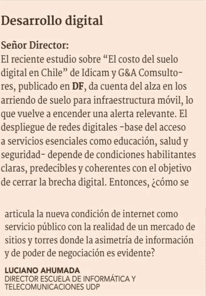 A partir de la publicación realizada en Diario Financiero, el Director de la Escuela de Informática y Telecomunicaciones de la Universidad Diego Portales, Luciano Ahumada, advirtió sobre una tendencia creciente que amenaza el desarrollo digital del país: el sostenido aumento en los costos de arriendo del denominado suelo digital para infraestructura de telecomunicaciones.
