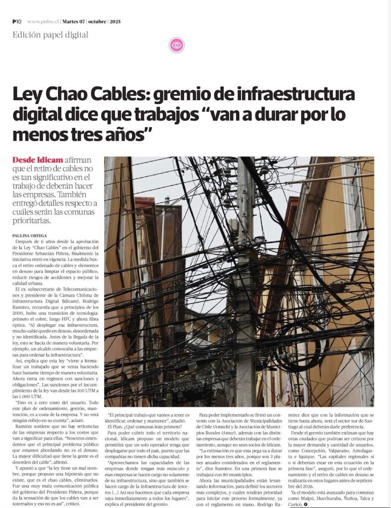 Pulso – La Tercera, nuestro presidente Rodrigo Ramírez Pino destacó que los trabajos de retiro de cables en desuso bajo la «Ley Chao Cables» se extenderán por al menos tres años, dada la magnitud del proceso, la coordinación con municipios y las capacidades técnicas requeridas para su correcta implementación.