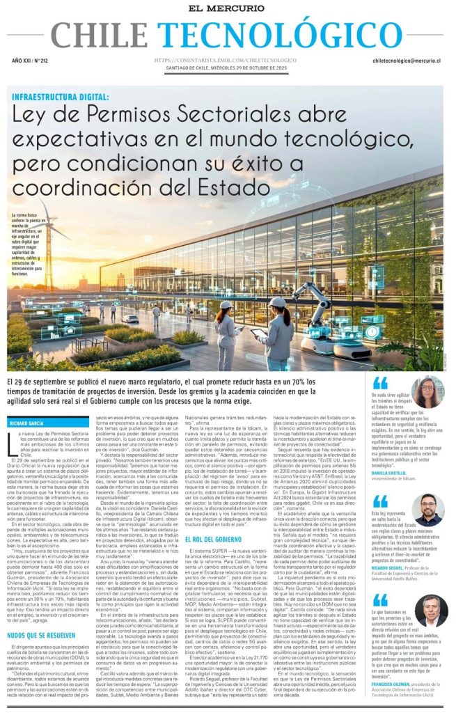 En la última edición de Chile Tecnológico de El Mercurio, nuestra vicepresidenta Daniela Castillo destacó la relevancia de la nueva Ley de Permisos Sectoriales, subrayando que su éxito dependerá de la coordinación efectiva del Estado y la capacidad de agilizar los procesos administrativos que hoy afectan el despliegue de infraestructura digital.